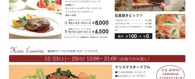 12/23[土]~25[月] 17:00~21:00(L.O.20:30) クリスマスディナー 雄武町のアンガス牛を使ったクリスマスディナーです。 ローストビーフ エビグラタン おこっぺモッツァレラのカプレーゼ ソーセージとキタアカリのピンチョス サーモンムースのブルスケッタ カボチャのポタージュ ベビーリーフのサラダ サーモンとミニトマトのクリームソース 自家製パン 牛ヒレステーキor牛リブロースステーキ クリスマススペシャルデザート 珈琲or紅茶 A.牛ヒレステーキコース 8,000円 B.牛リブロースステーキコース 6,500円 ※クリスマスディナーは基本的にご予約制となっております。 12/23[土]~25[月] 17:00~21:00(L.O.20:30) クリスマスオードブル [...]